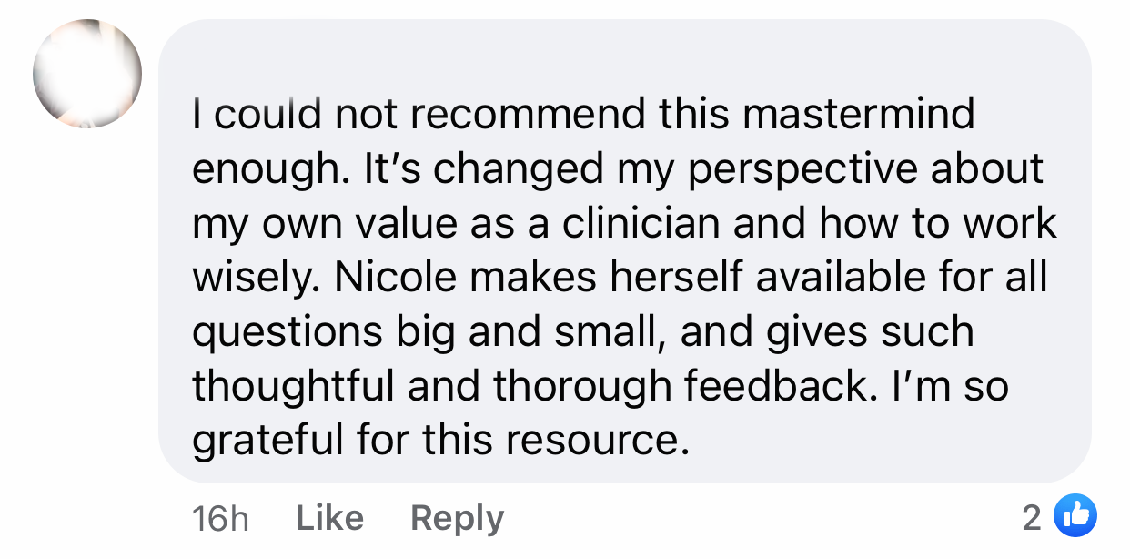 Nicole helped me to push through some of my own blocks and the community that is cultivated through her mastermind is absolutely amazing and a HUGE source of support.